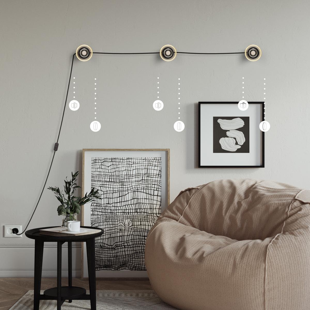 Cable A: from plug to 1st light point : 2.15mt. [XZ2RC04] Cotton Charcoal Black Textile Cable - The Original Creative-Cables - RC04 round 2x0.75mm / 3x0.75mm - N° of cores: 2x0.75